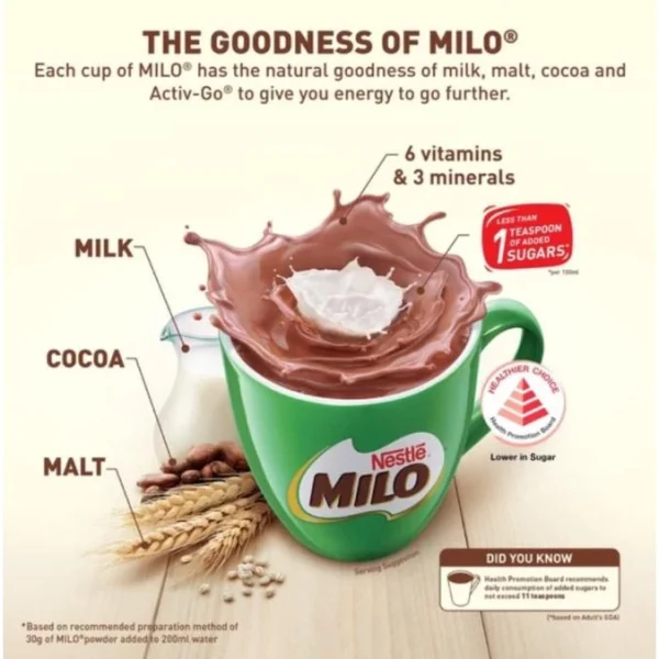 Ingredients: Sugar, Skimmed Milk(Cow’s Milk), Malt Extract (Contains Barley), Cocoa, Palm Oil, Emulsifier, Dicalcium Phosphate, Magnesium Carbondate, Disodium Phosphate, Vitamin C, Soya Lecithin, Nicotinamide, Vanillin, Ferric Panthothenate, Vitamin B6, Vitamin B1, Vitamin B2, Biotin, Cyanocobalamin