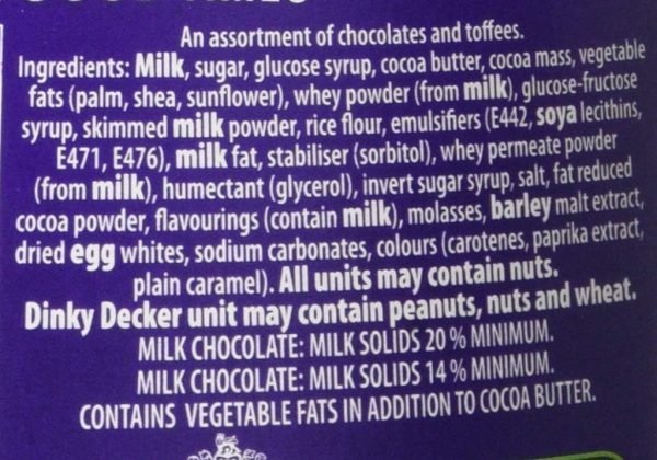MILK, Sugar, Glucose Syrup, Cocoa Butter, Cocoa Mass, Vegetable Fats (Palm, Shea), Whey Powder (from MILK), Glucose-Fructose Syrup, Skimmed MILK Powder, Whole MILK Powder, Rice Flour, Emulsifiers (SOYA Lecithins, E442, E476, E471), Whey Permeate Powder (from MILK), MILK Fat, Stabiliser (Sorbitol), Humectant (Glycerol), Invert Sugar Syrup, Fat-Reduced Cocoa Powder, Salt, Flavourings (contain MILK), Molasses, BARLEY Malt Extract, Dried EGG Whites, Acidity Regulator (Sodium Carbonates), Colours (Carotenes, Paprika Extract, E150d), Milk Chocolate: Milk Solids 20 % minimum, Milk Chocolate: Milk Solids 14 % minimum, Contains Vegetable Fats in addition to Cocoa Butter