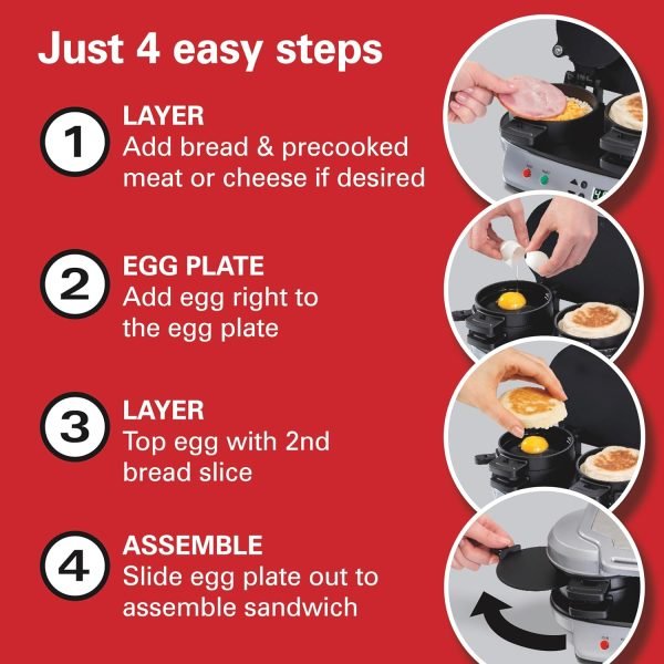 Simply 1) add bread and precooked meat or cheese to the bottom cooking plate. 2) Crack an egg into the upper egg plate; then 3) layer the second piece of bread on top of the egg and close the lid. 4) Once your sandwich is done cooking, just slide the egg plate out to assemble the sandwich.