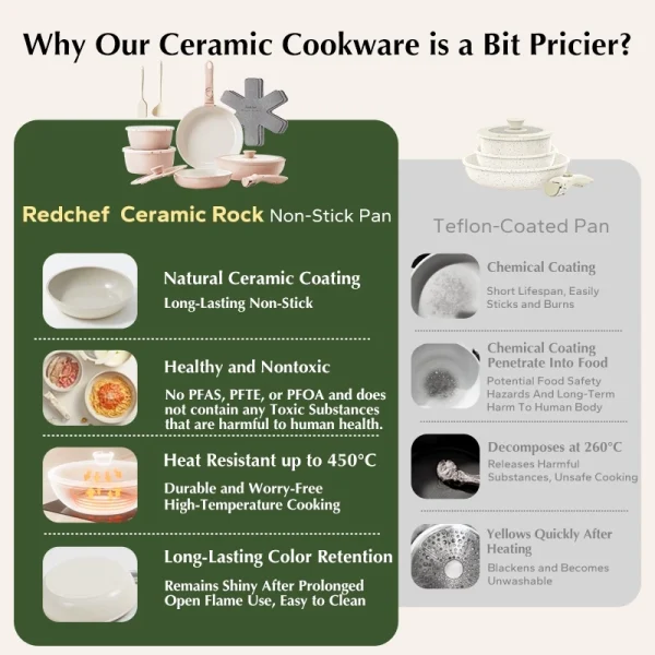 ✅Redchef Ceramic Rock Coating is a stable-performing non-metallic inorganic coating that is non-toxic, harmless, and free from PFAS, PFOA, and PTFE. It is non-stick, wear-resistant, corrosion-resistant, high-temperature resistant, easy to clean, and features a stainless steel + ceramic coated bottom. It is compatible with all stovetops (induction, gas, ceramic) and dishwasher safe.