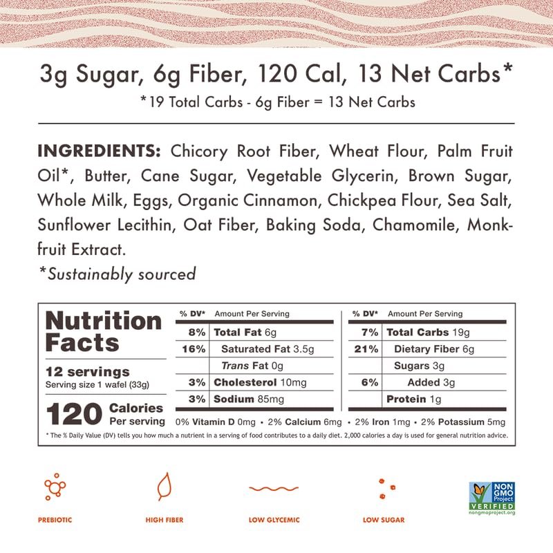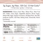 Chicory Root Fiber, Wheat Flour, Palm Fruit Oil*, Butter, Cane Sugar, Vegetable Glycerin, Brown Sugar, Whole Milk, Eggs, Organic Cinnamon, Chickpea Flour, Sea Salt, Sunflower Lecithin, Oat Fiber, Baking Soda, Chamomile, Monkfruit Extract. *Sustainably sourced